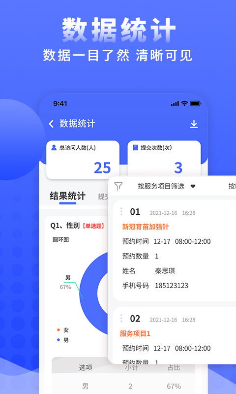 4. 数据实时同步,支持Excel导出与基础统计图表(柱状图、饼图等)
