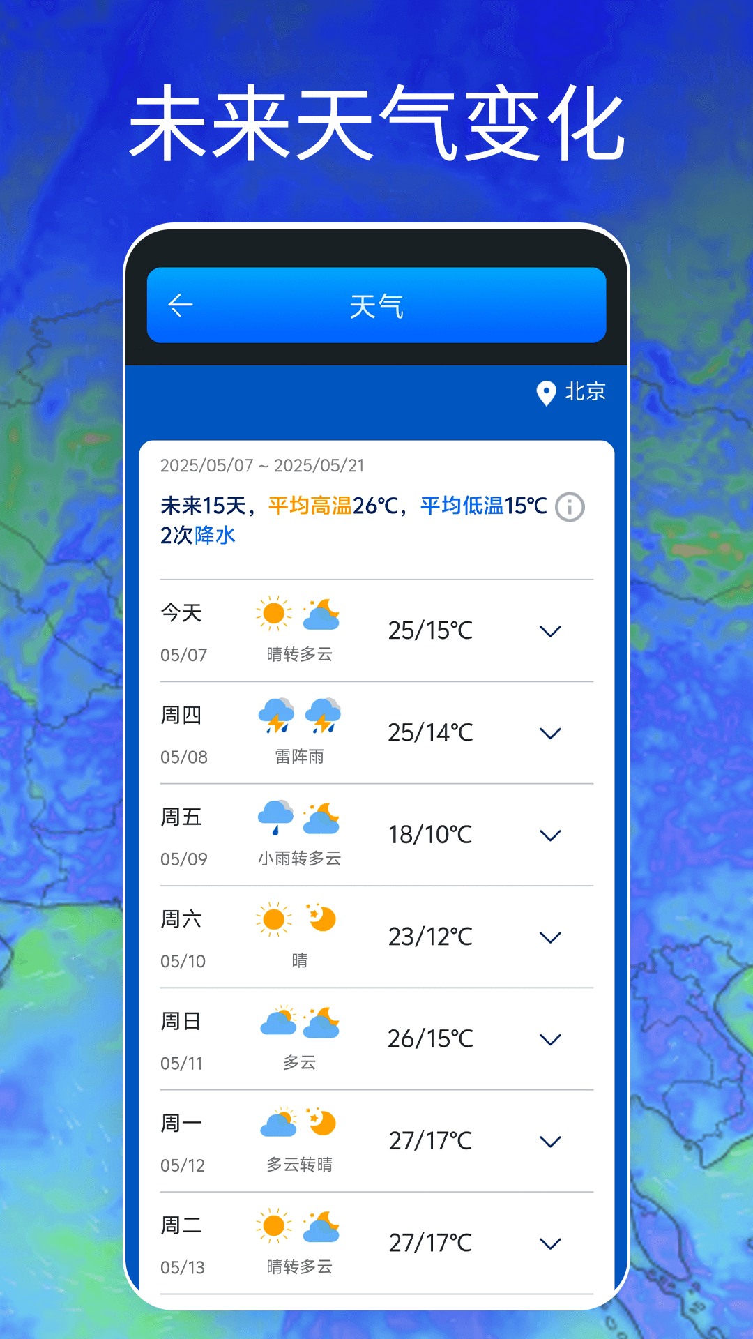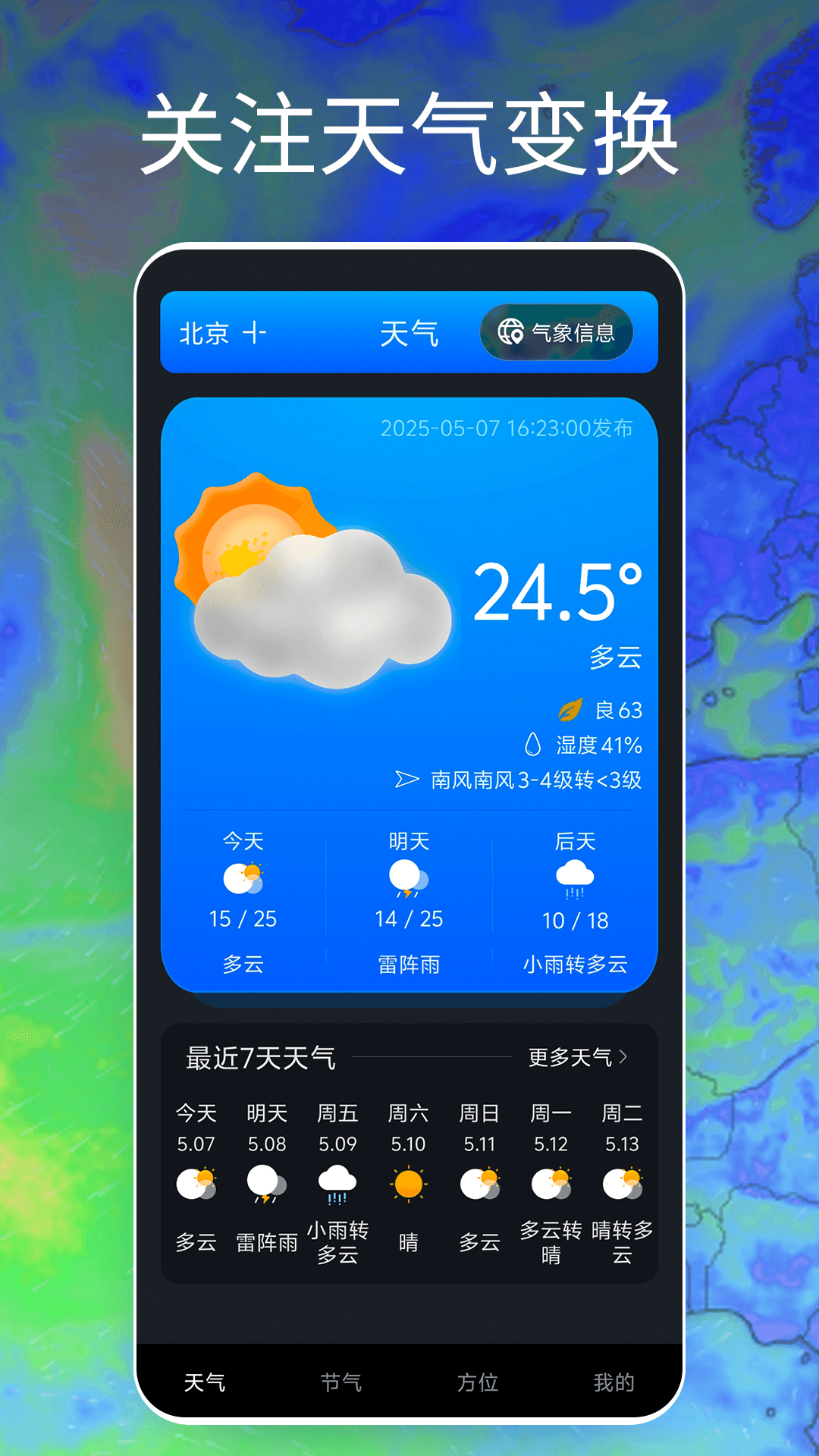 - 提供全动态天气地图,可播放未来7天天气变化趋势