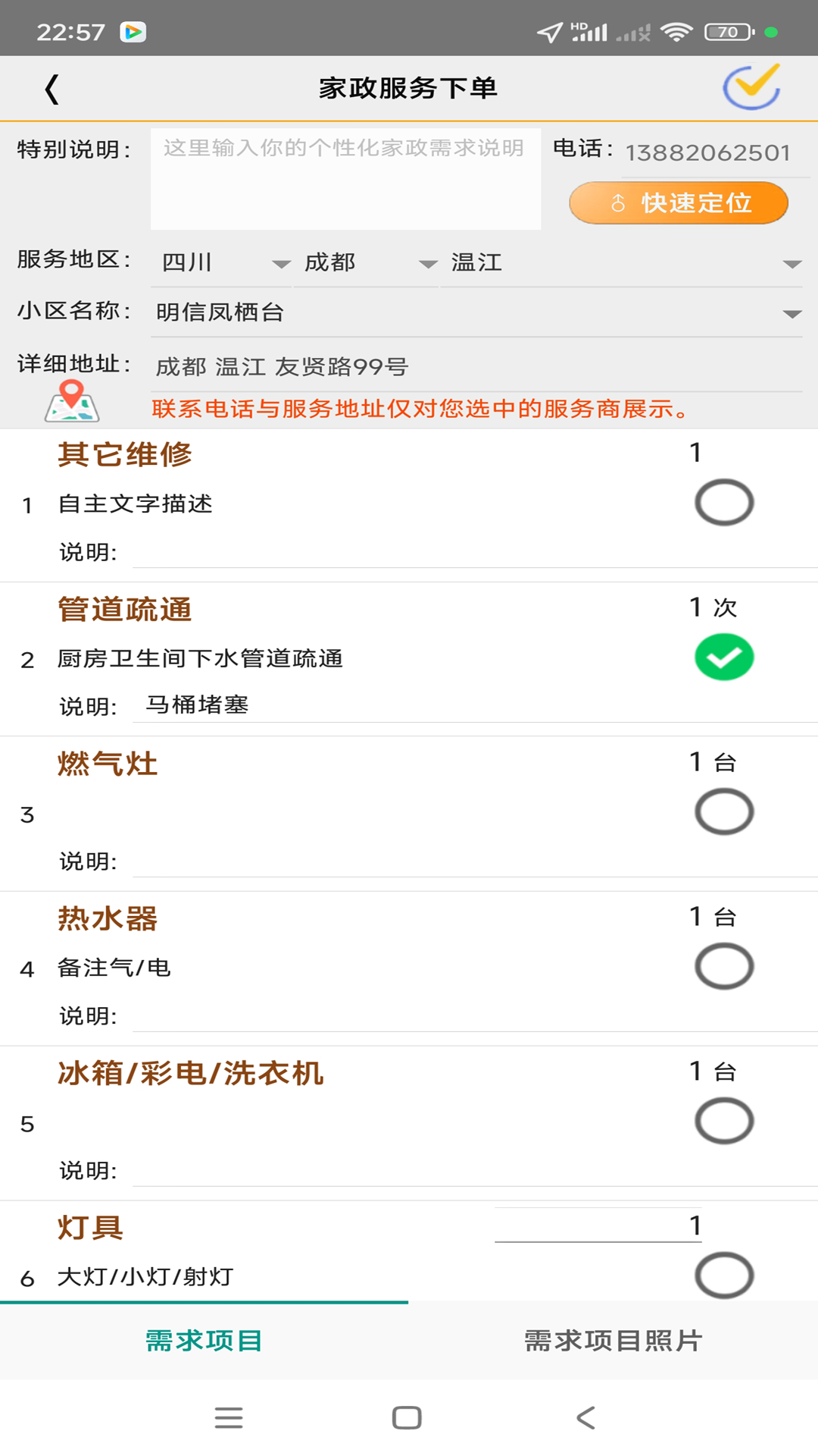 2. 选择所需服务类型,填写时间、地址及具体需求