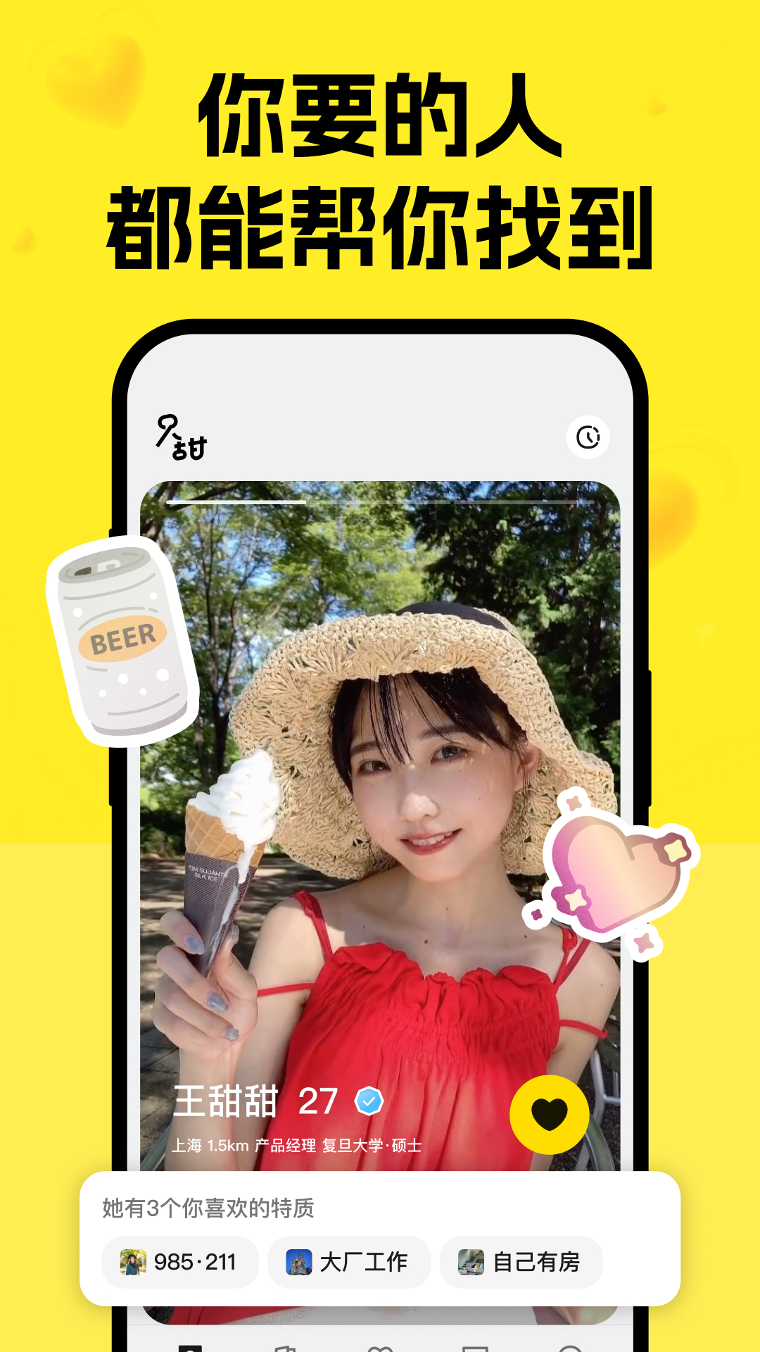 2. 进入“遇见”页浏览推荐伙伴,点击心形图标表达好感