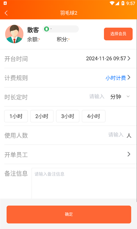 2. 点击“新开台”按钮,选择台号、顾客类型(散客/会员)、计费方式并确认;