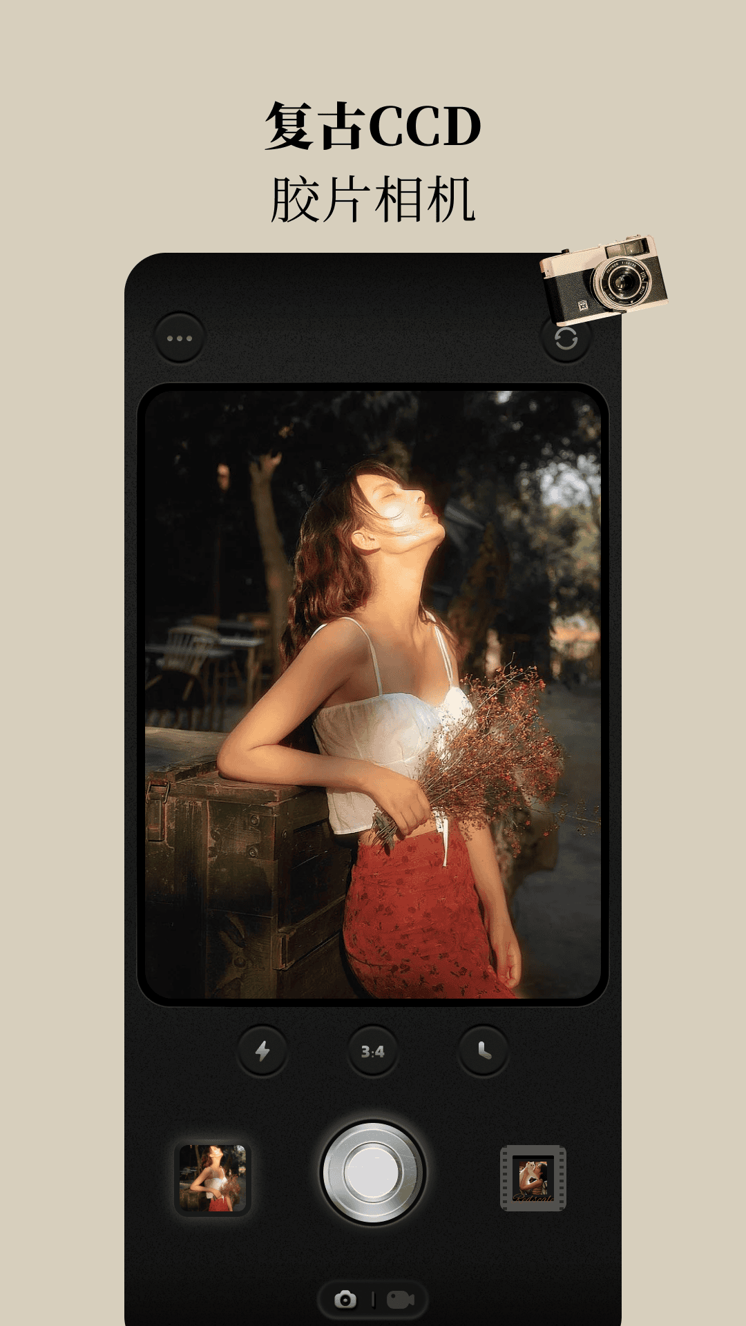 2. 拍照或从相册导入图片,点击滤镜图标应用胶片效果并调整曝光/颗粒度