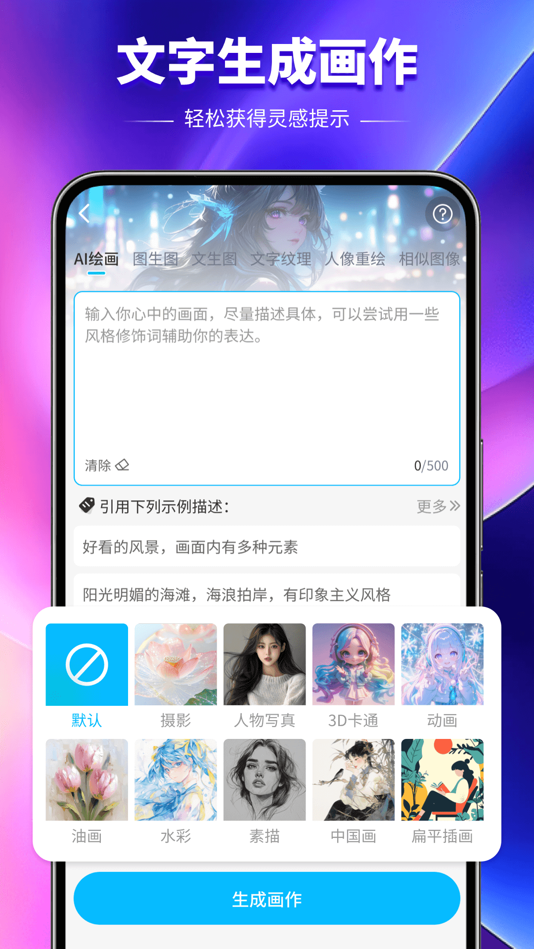 2. 点击“Create”选择图像类型(如Portrait、Landscape、Morph),或上传参考图;