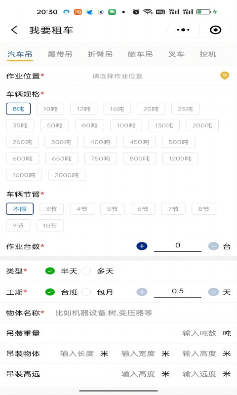- 在首页选择所在城市,输入所需吊车型号或作业半径等参数进行搜索。
