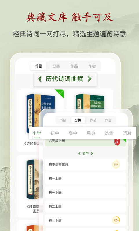 - 界面简洁,操作便捷,支持按作者、朝代、主题分类检索