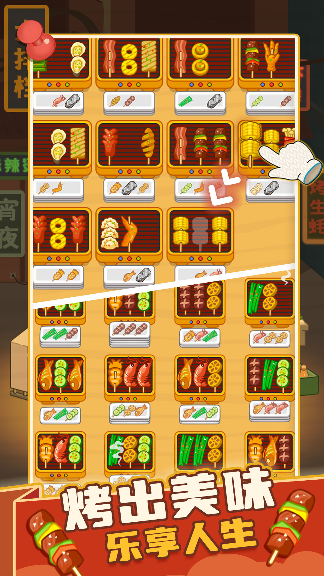 1. 首次启动后跟随新手引导,学习基础烤串流程(穿串→腌制→烤制→撒料→装盘)